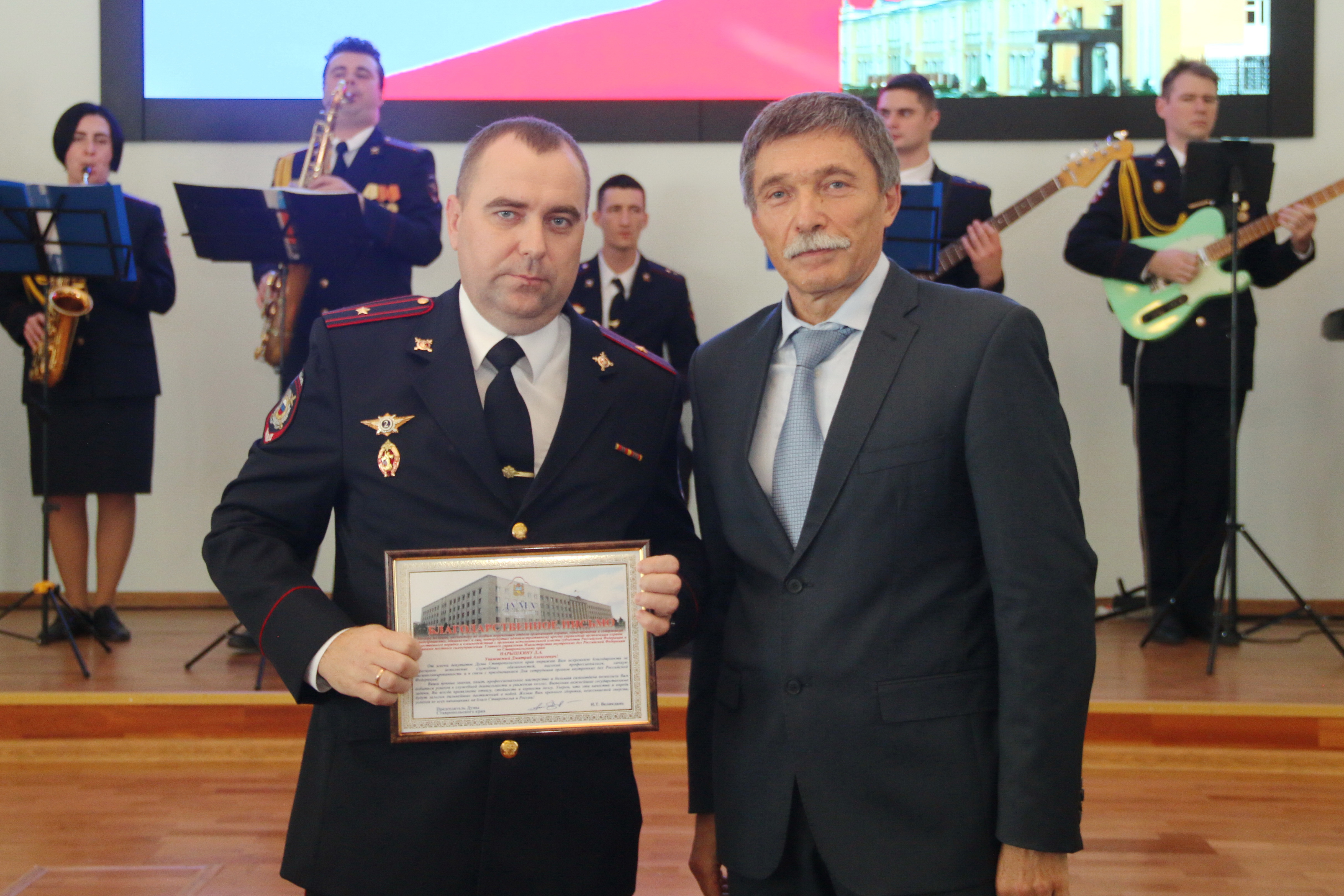 В ходе торжественного собрания Дмитрий Судавцов вручил Почетную грамоту Думы Ставропольского края и благодарственные письма лучшим сотрудникам органов внутренних дел за высокий профессионализм, добросовестную службу и значительный вклад в обеспечение общественного порядка и безопасности жителей региона.