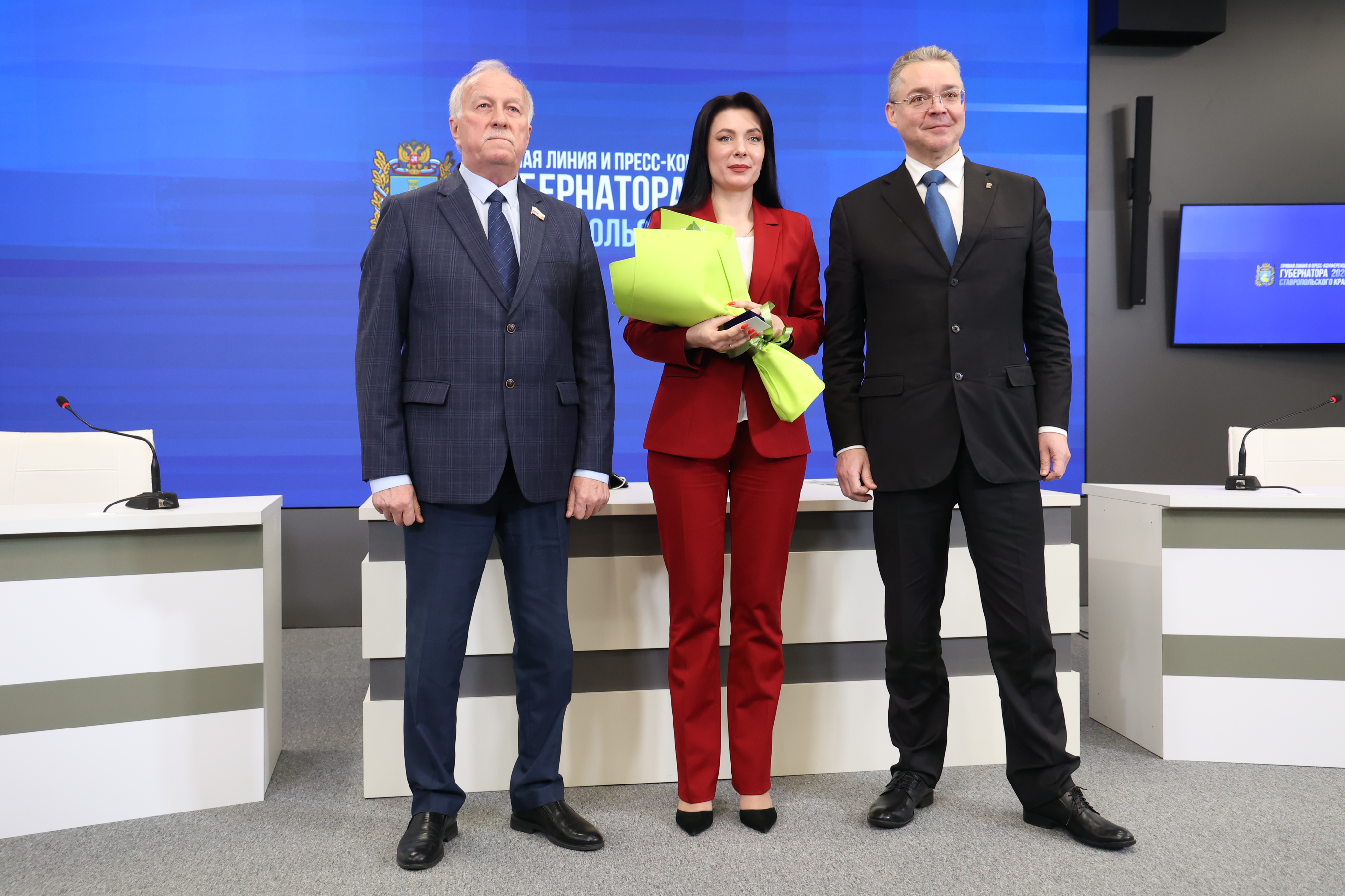 Особые слова признательности председатель Думы адресовал ветеранам журналистики в лице присутствующей на церемонии Эммы Павловны Каравинской – легендарного диктора краевого радио, отдавшей работе в эфире более 40 лет. Николай Великдань поблагодарил ее за многолетний труд и вместе с губернатором вручил медаль «За заслуги перед Ставропольским краем».