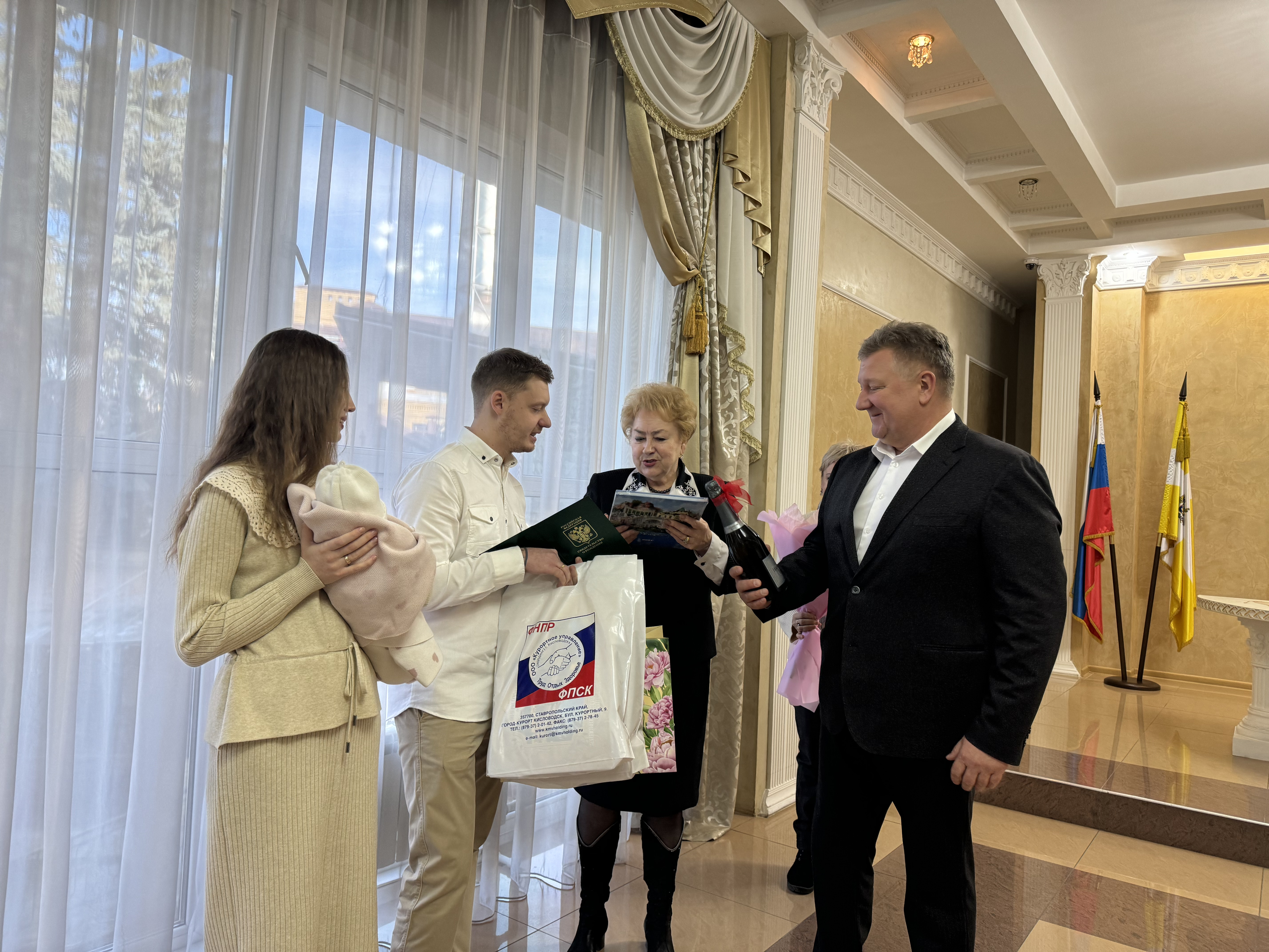 Единоросс вместе с председателем Думы Кисловодска, представителями духовенства и местной славянской общины вручил молодоженам подарки и цветы.